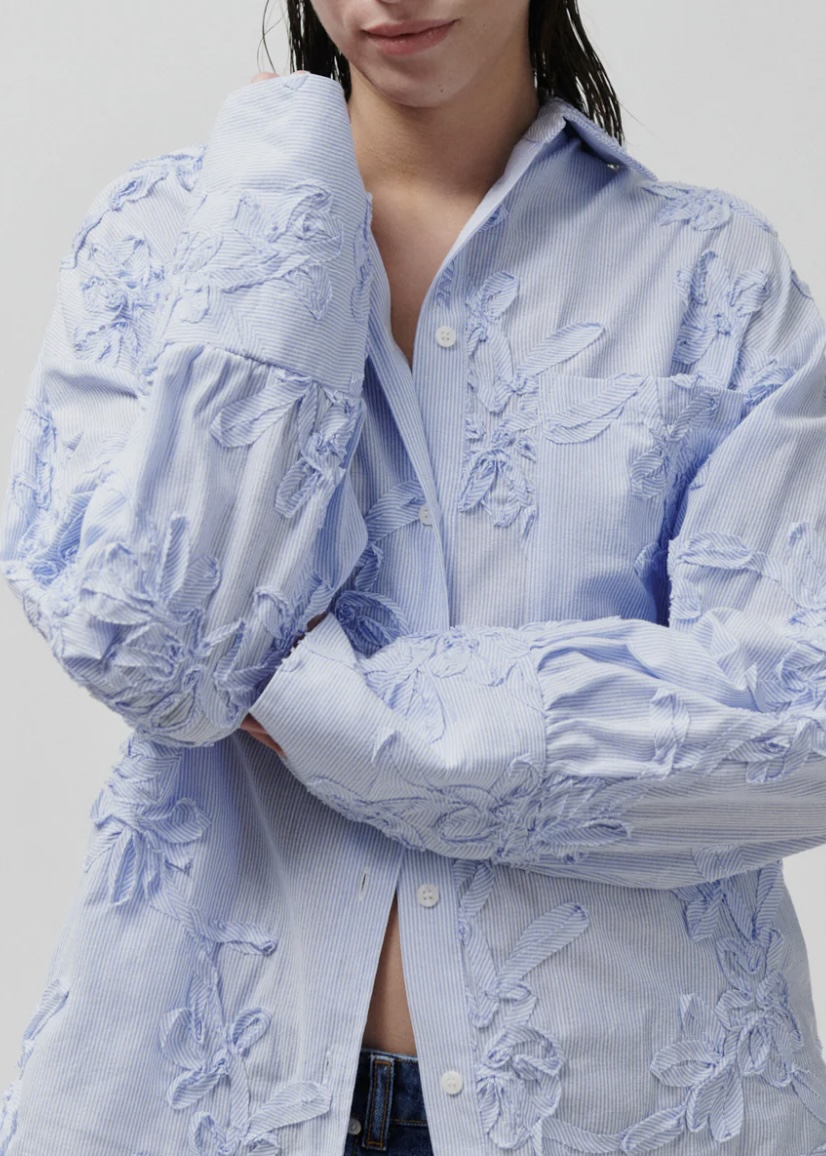 The button-up shirt features a curved and dipped hem, as well as chest pockets. There is a artistic, textural floral decals throughout the shirt. Wear it over straight-leg jeans for an effortlessly chic look. 74% cotton, 26% polyester.