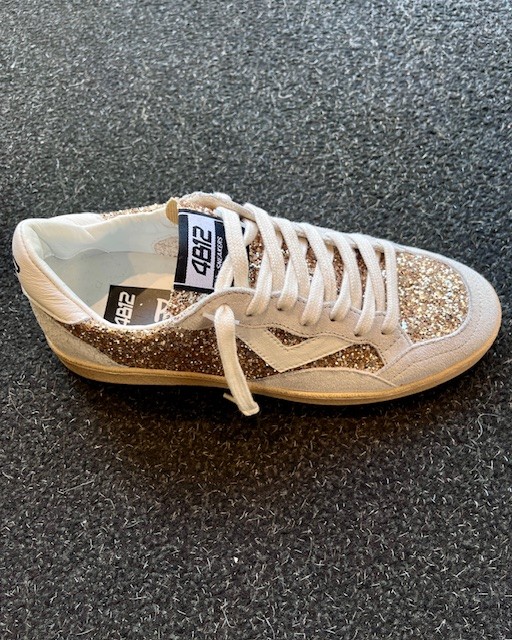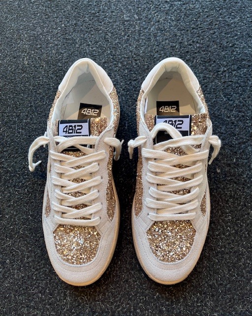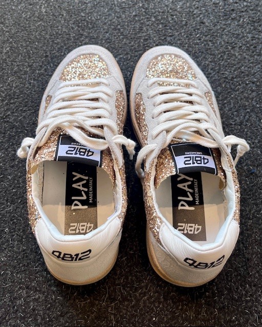 These sneakers have an American college vibe. The model has vintage finish crafted from white calf-skin leather & suede upper, inner leather and cotton. Features a leather heel tab, glitter on the sides and the off-white laces add the finishing touch. Made in Italy.