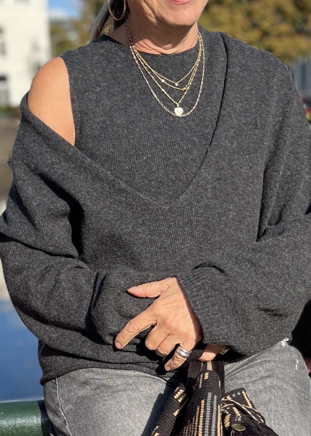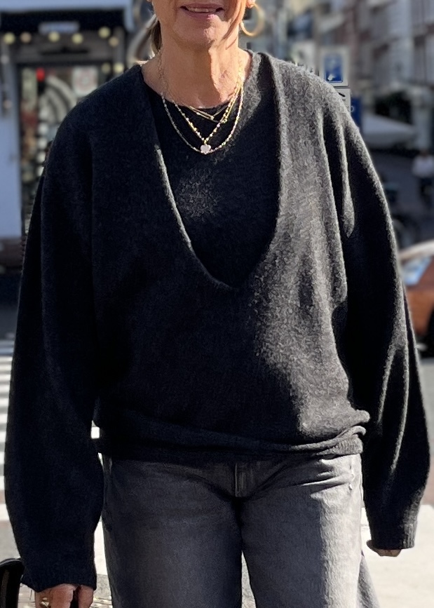 Alysi slim, sleevless knit under a relaxed a deep V-neck sweater adds depth, which you can let the sleevless knit peek through.  The sweater features a deep V-neck and dropped shoulders.  100% wool.  Made in Italy