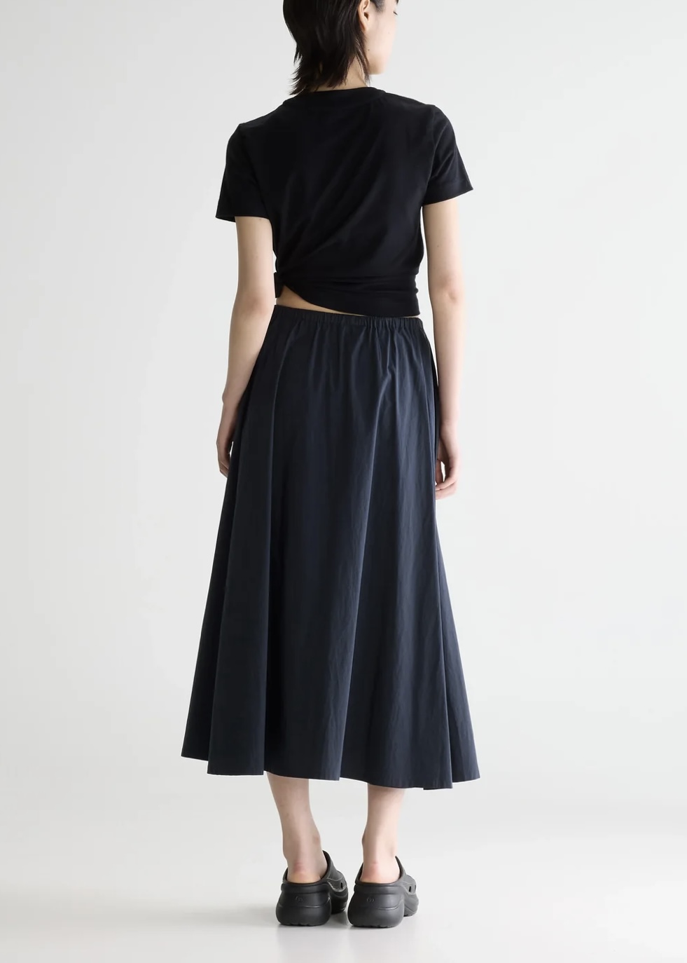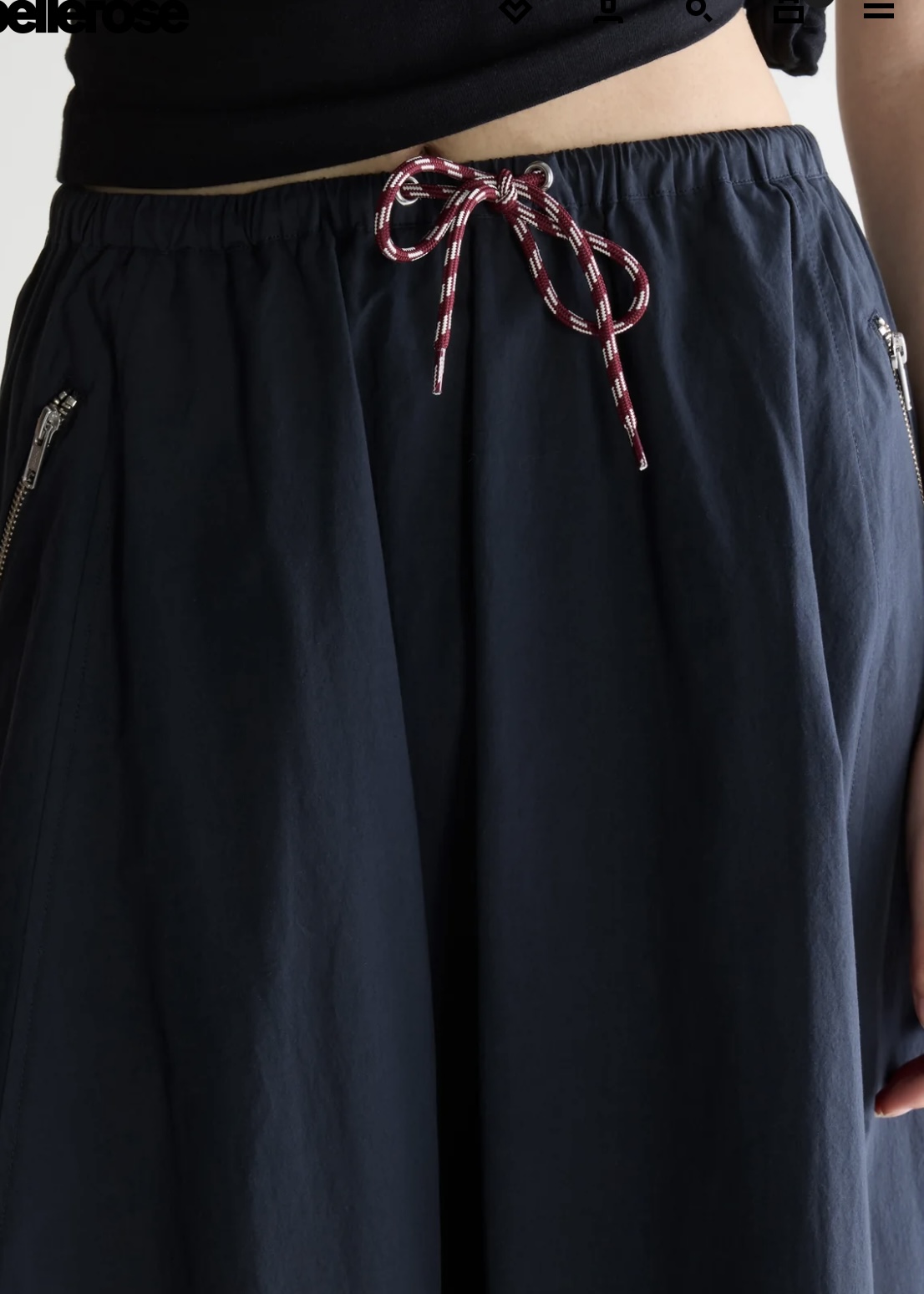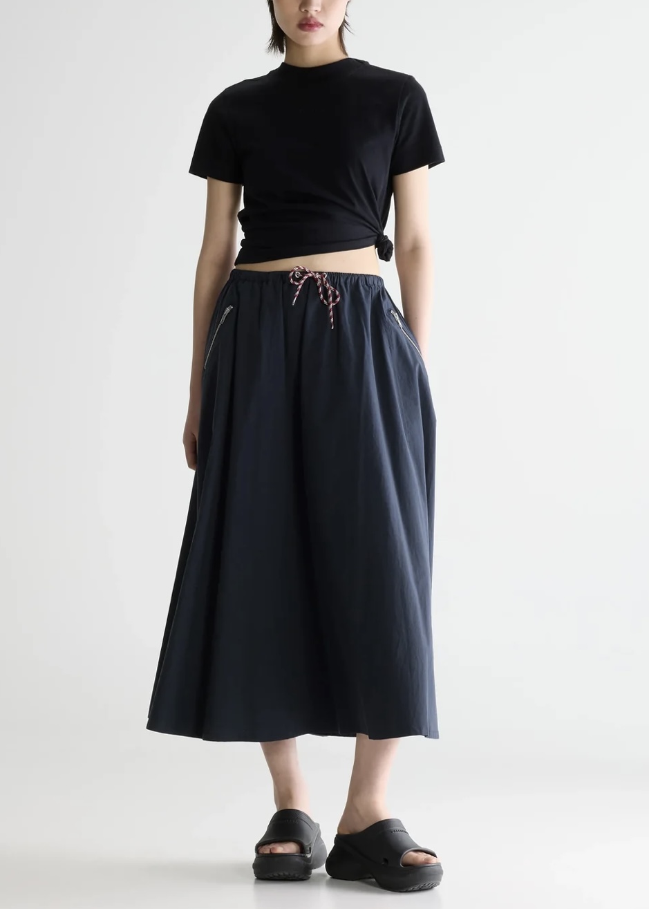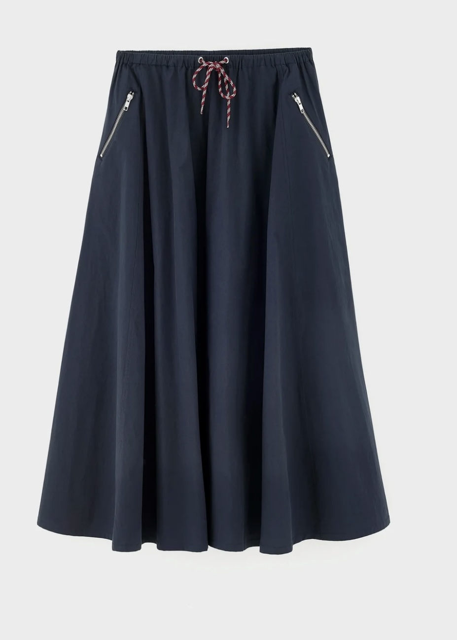 This A-line midi skirt features a waistband with a contrasting red & white tie-rope and pockets with zip closures in marine blue cotton.