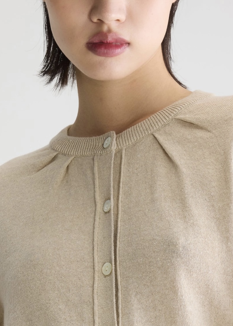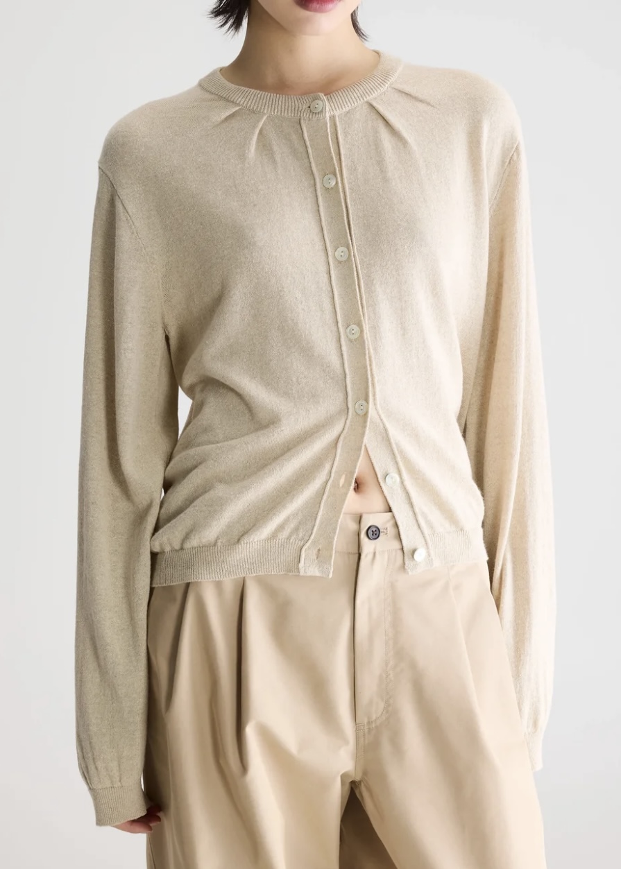 This round-neck cardigan blends classic charm with delicate detailing crafted from linen-blend. Soft pleats accent the neckline, adding subtle texture and refined finish, while matching pleated cuffs creates a cohesive and elegant touch. Perfect for dressing up a simple outfit.