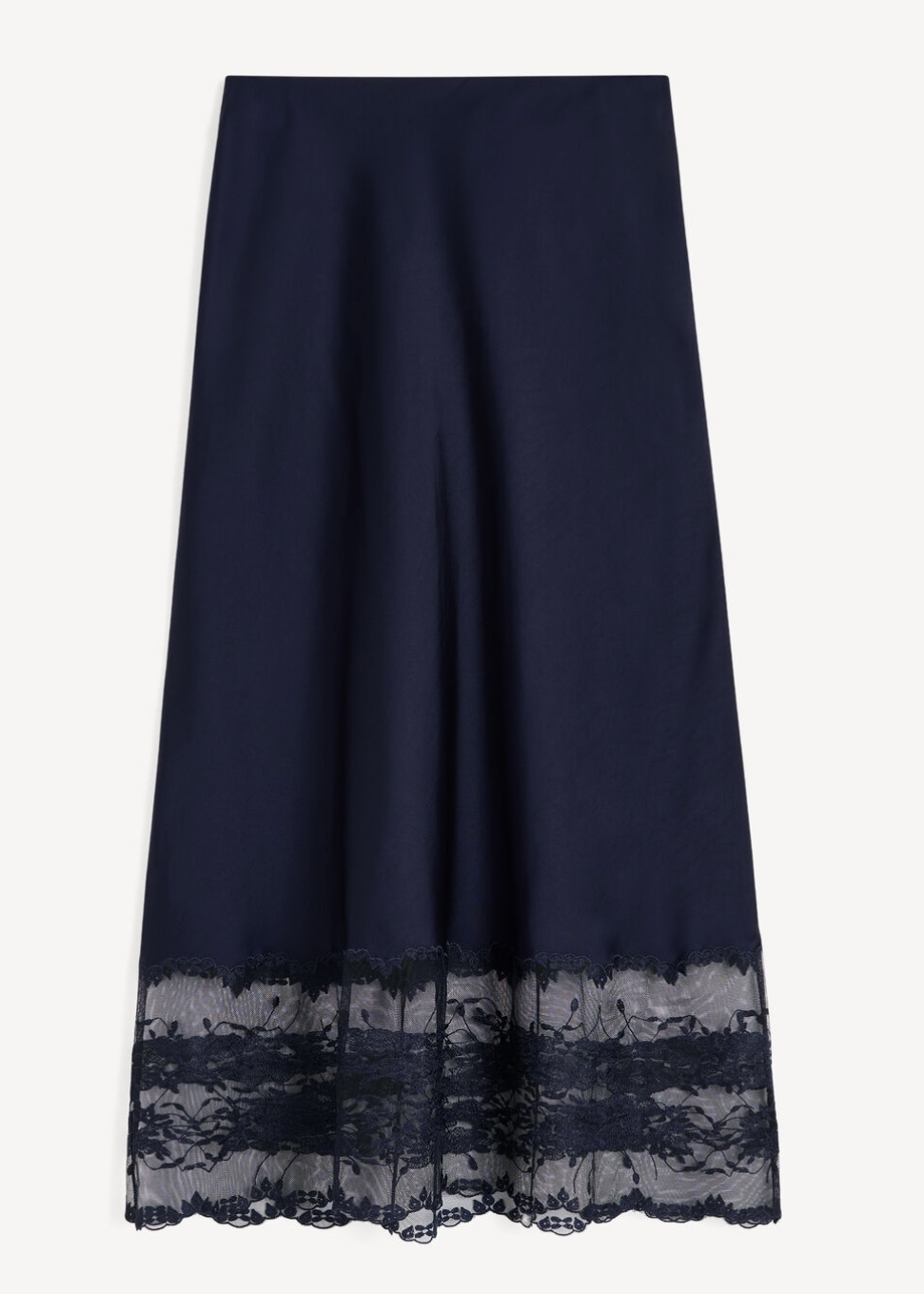 Add a sense of modern bohemia to your year-round wardrobe with the Blake skirt. The maxi design is made in satin and decorated with a delicate lace at its bottom. Wear with a oversized sweater for a casual look