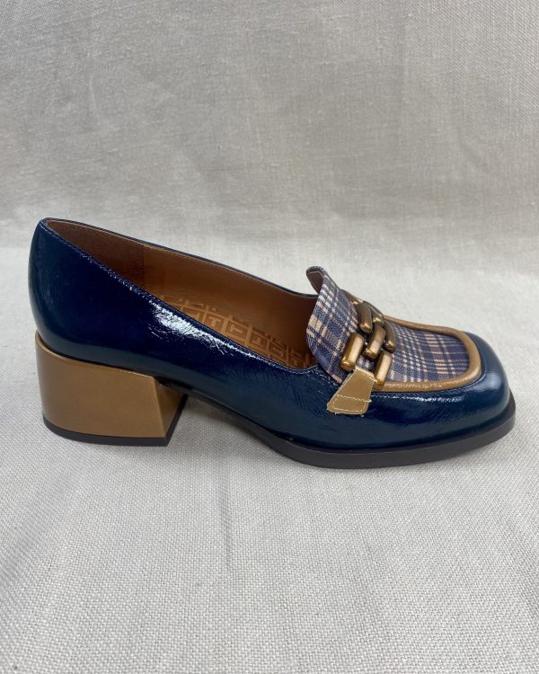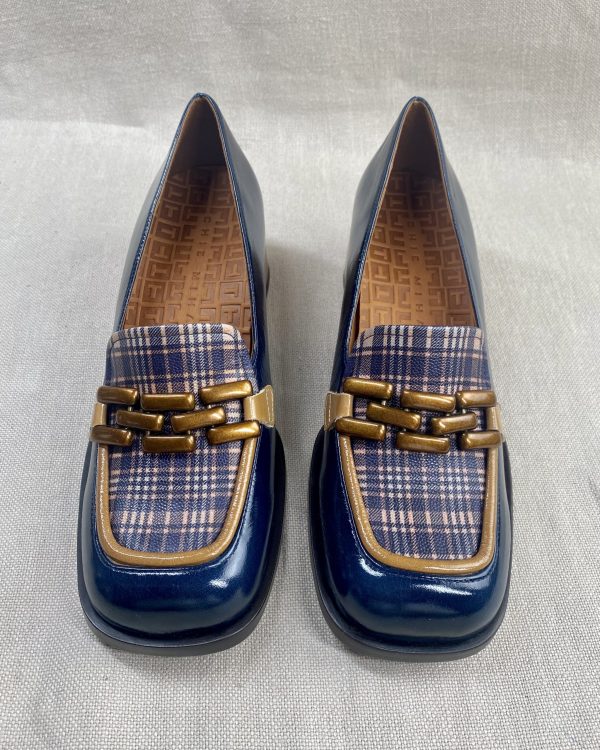 These pumps in patent effect on leather with scotch pattern front tab and a resin buckle. Features soft leather lining, leather sole with anti-slip rubber piece on the bottom. Heel height 4cm. Made in Spain.