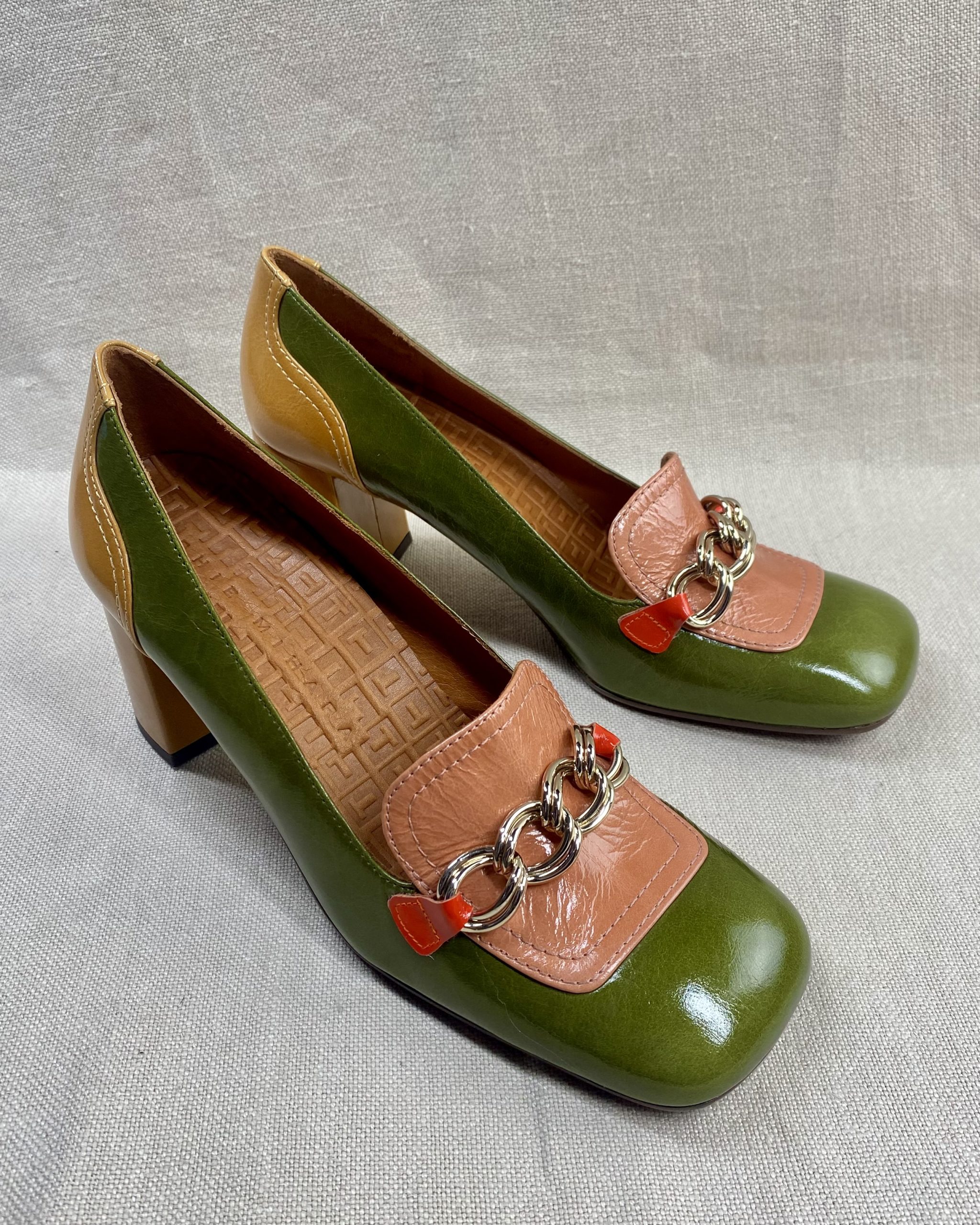 These pumps in patent effect on leather with a chain on front tab. Features soft leather lining, leather sole with anti-slip rubber piece on the bottom. Heel height 6cm. Made in Spain.