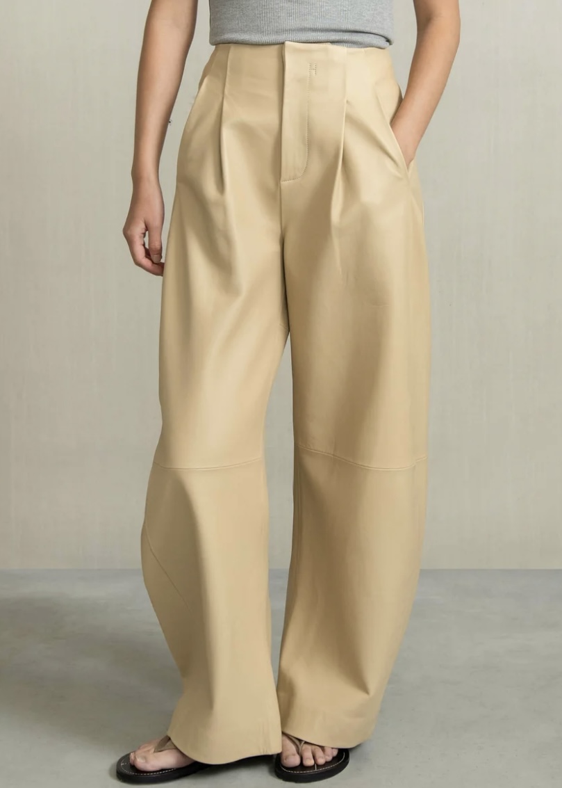 Lamb leather barrel leg trousers bring a modern edge to a timeless silhouette. Crafted from supple leather. The contemporary barrel leg shape , relaxed through the hip and thigh with a subtle taper towards the ankle, creating a flattering profile. 100% leather.
