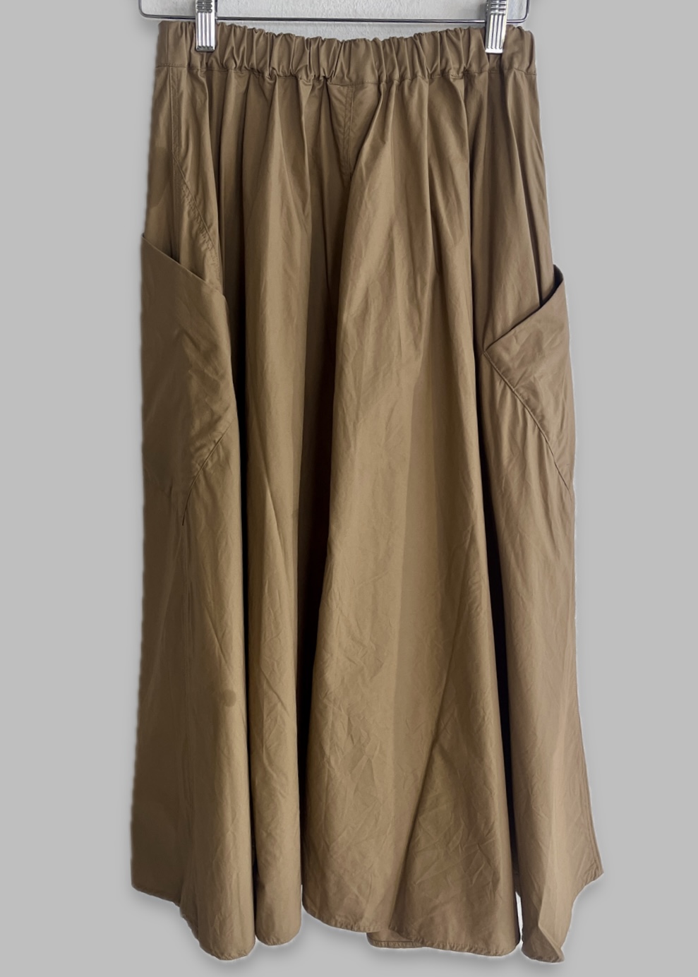 From Ichi Antiquités, this skirt crafted from cotton in A-line shape, features an elasticated waistband with a tie string and side patch pockets. One size fits all. Made in Japan.