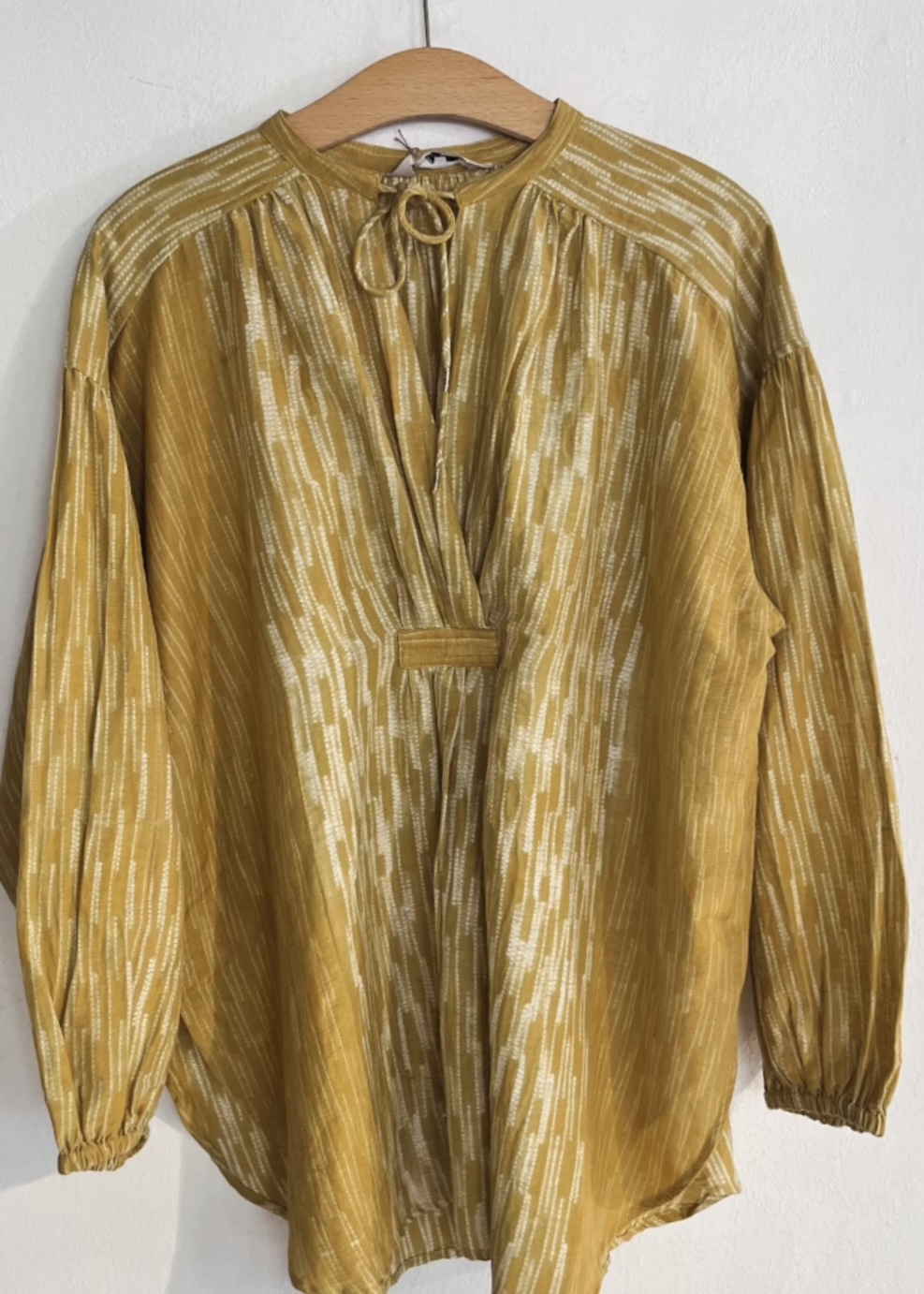 This blouse, features a tie-dye print with warmth and artisanal flair. Features a V-neckline with a tie string and a subtle mandarin collar. The dropped shoulders lead into billowing lantern sleeves with elasticated cuffs for a romantic voluminous look.
