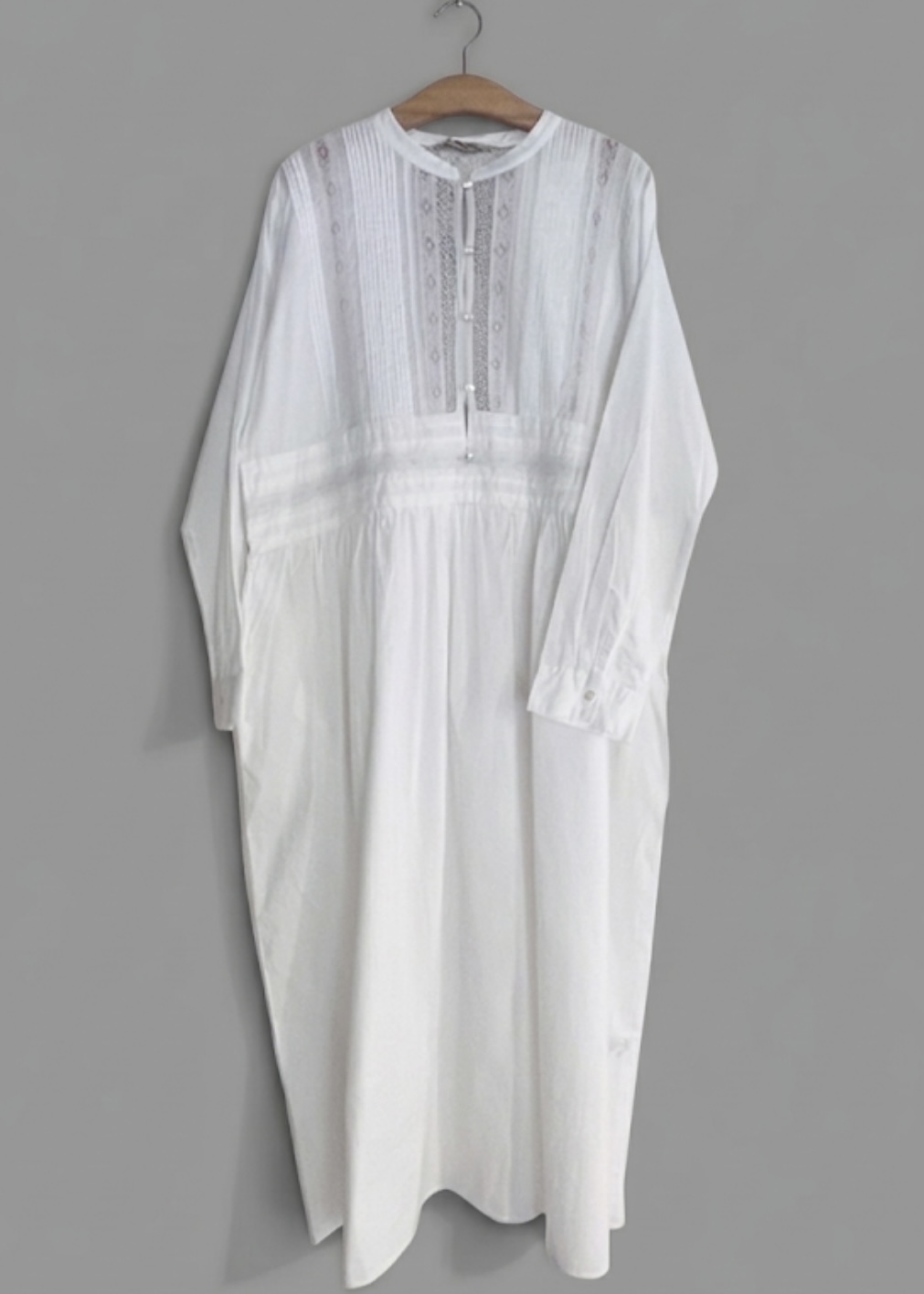 From Ichi Antiquités, this slipover dress crafted from cotton. Features a stand collar, a delicate front panel lace details, mother of pearl buttons, long sleeves with cuffs and side pockets. One size fits all. Made in Japan.