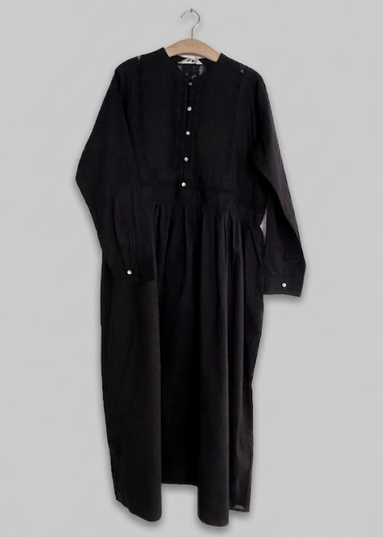 From Ichi Antiquités, this slipover dress crafted from cotton. Features a stand collar, a delicate front panel lace details, mother of pearl buttons, long sleeves with cuffs and side pockets. One size fits all. Made in Japan.