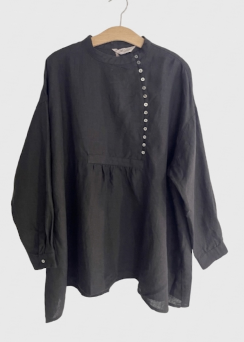 Effortlessly chic, this blouse features mother of pearl buttons along the front that balances sophistication with modern simplicity. 100% linen. One size fits all. Made in Japan.