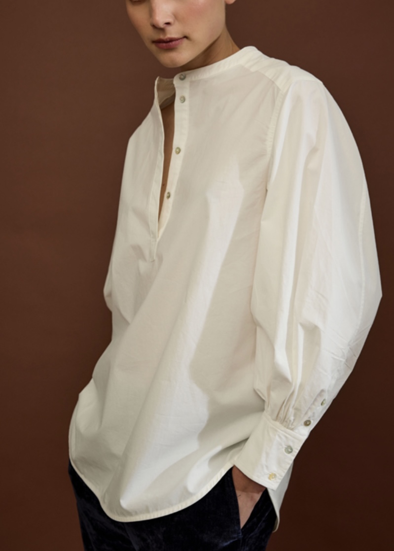 A crisp, collarless white blouse crafted from soft cotton. This elegant piece features gently gathered balloon-style sleeves, adding subtle volume and a feminine touch. 100% cotton.