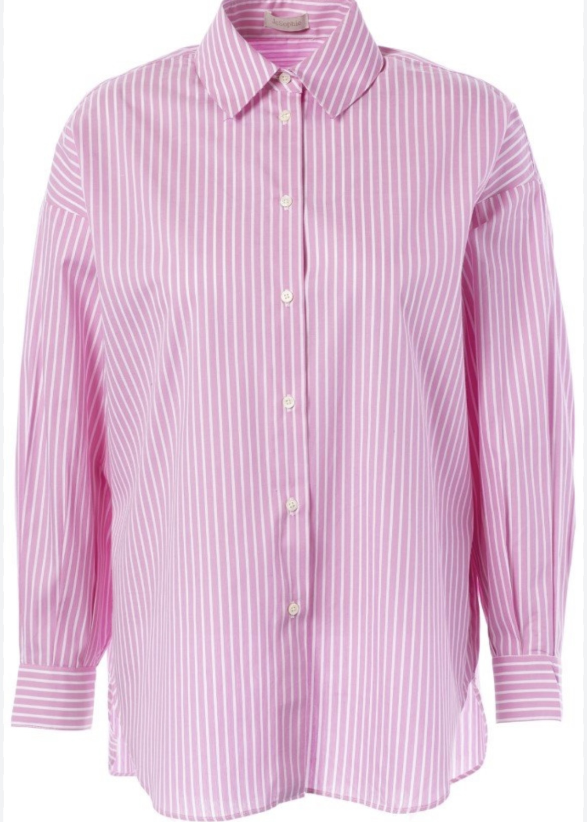 The Karli shirt is an oversized shirt crafted from organic cotton. The shirt features a regular collar, long sleeves and a mother of pearl button-down front. It has a chest pocket and a curved hem.