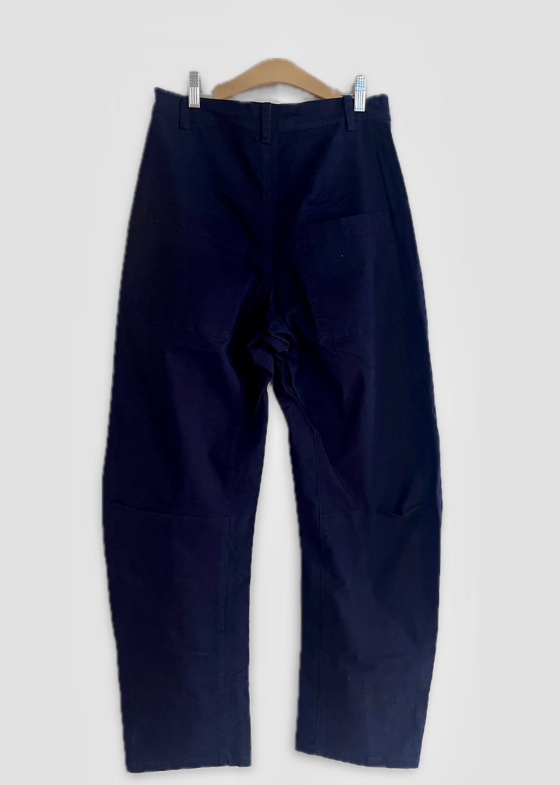 These modern trousers are cut in a sculptural barrel-leg shape that’s enhanced by the folded detail at the knee. They’re crafted from cotton and designed with a concealed fly-zip , button and two front patch pockets on the front and back. 100% cotton.