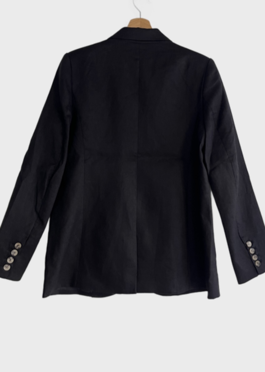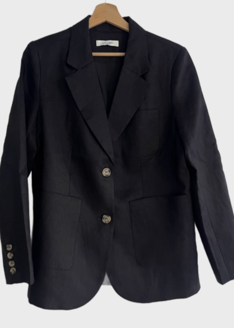 A lightweight linen blazer with a relaxed yet tailored silhouette, featuring a classic breast pocket and two front patch pockets.  Fully linen on the inside, it offers breathable comfort while maintaining a clean look.  100% linen.