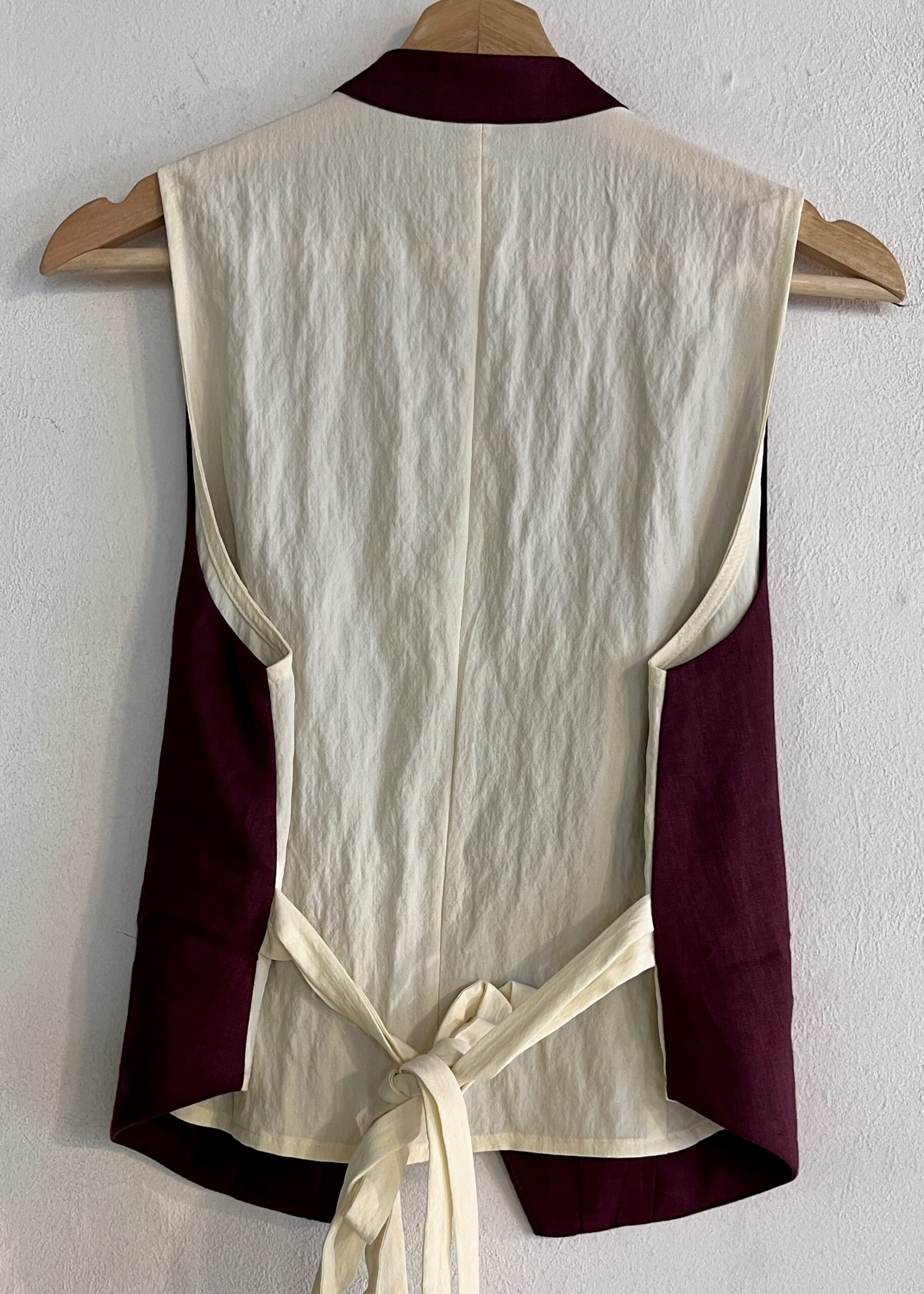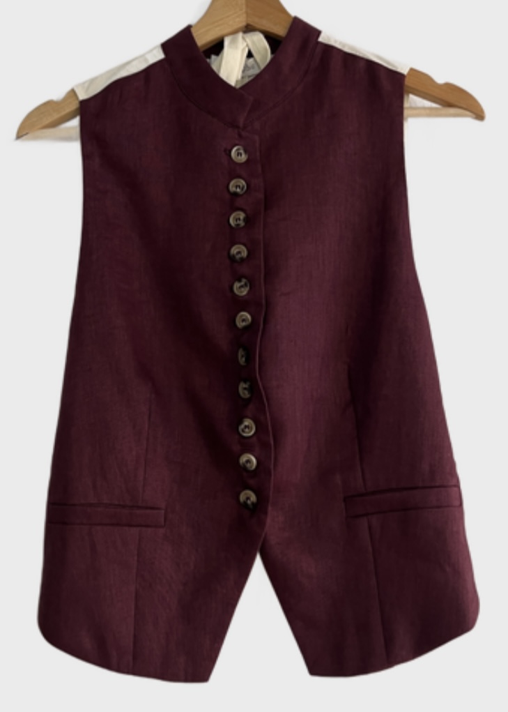 A refined linen waistcoat features a clean, tailored front and a contrasting back for subtle visual interest.  Lightweight and breathable, it’s designed to add texture and character while maintaining a sharp, effortless silhouette.  100% linen.