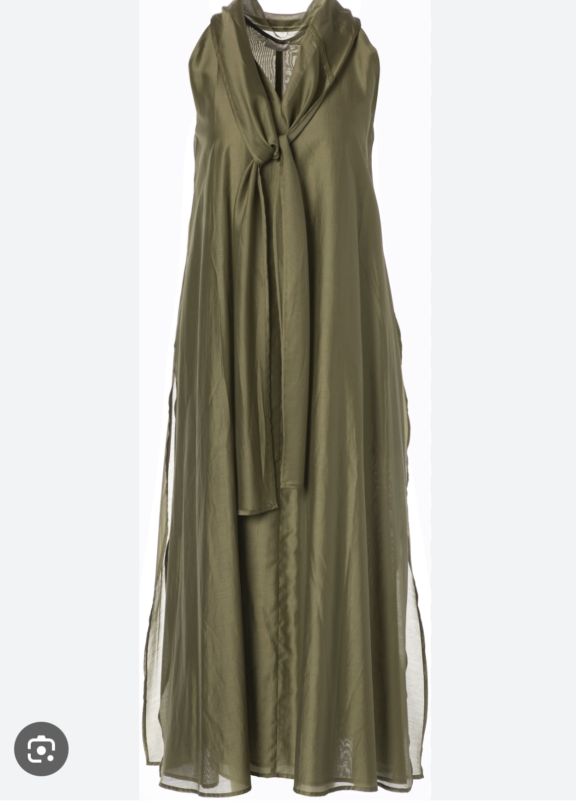 A long sleeveless dress made from tencel that drapes fluidly along the body, soft and cool to the touch. The fabric has a natural, silky sheen that catches the light with its understated clean lines. The flowing length creates a graceful silhouette. The overall effect is modern and refined.