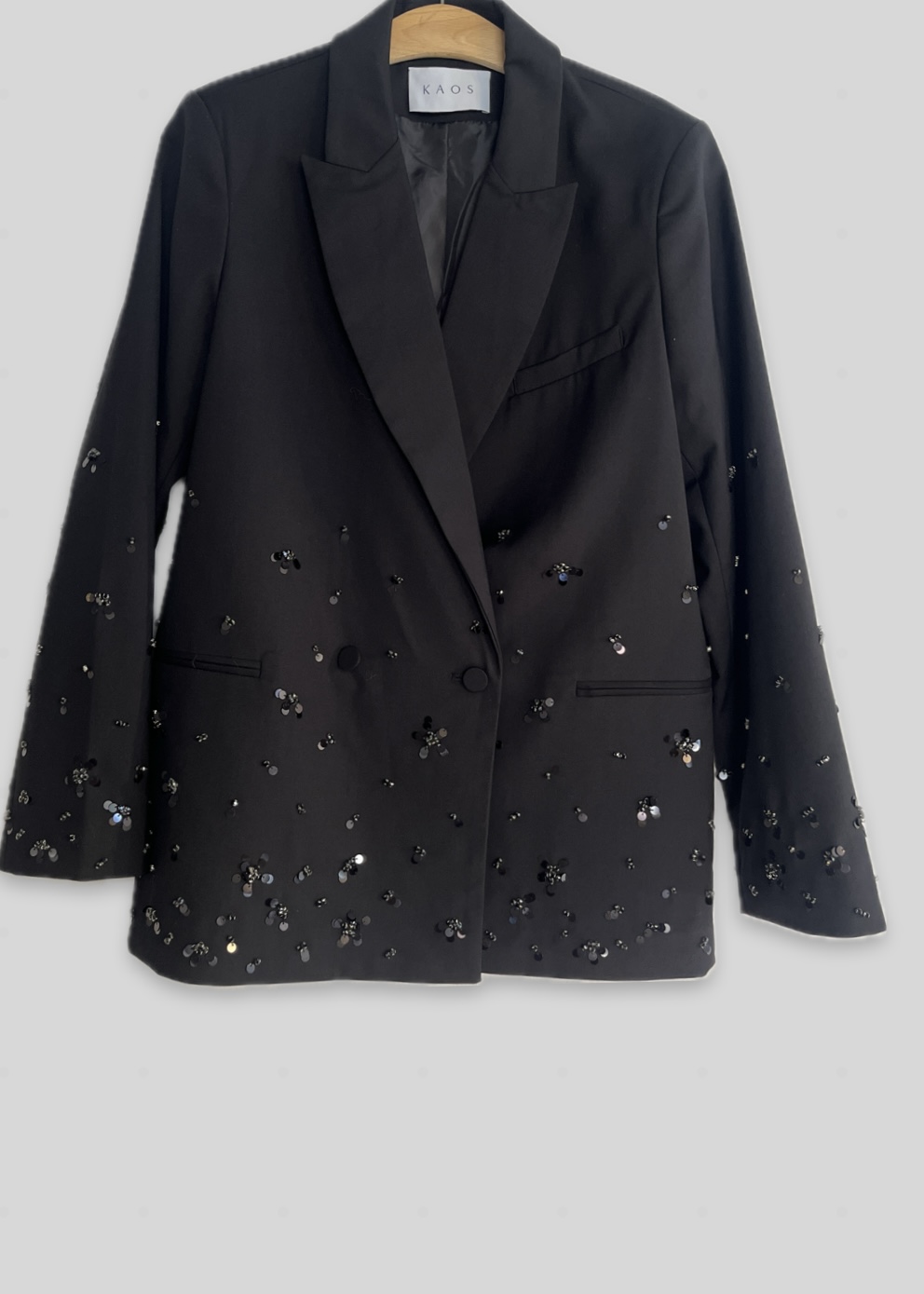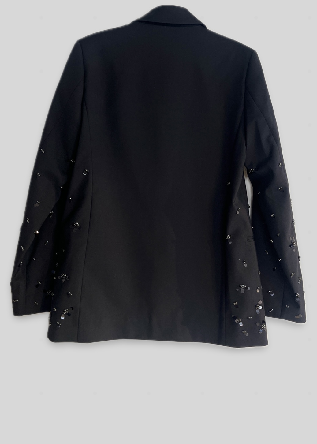 This stunning embellished blazer where bold glamour meets modern edge crafted with delicate cut-out flower sequins.  This statement piece adds instant texture to your wardrobe.  Perfect for night outs, festive occasions or anytime you want to stand out.  Pair it with a sleek skirt or with your favourite jeans for the effortlessly chic appeal.  Made in Italy.