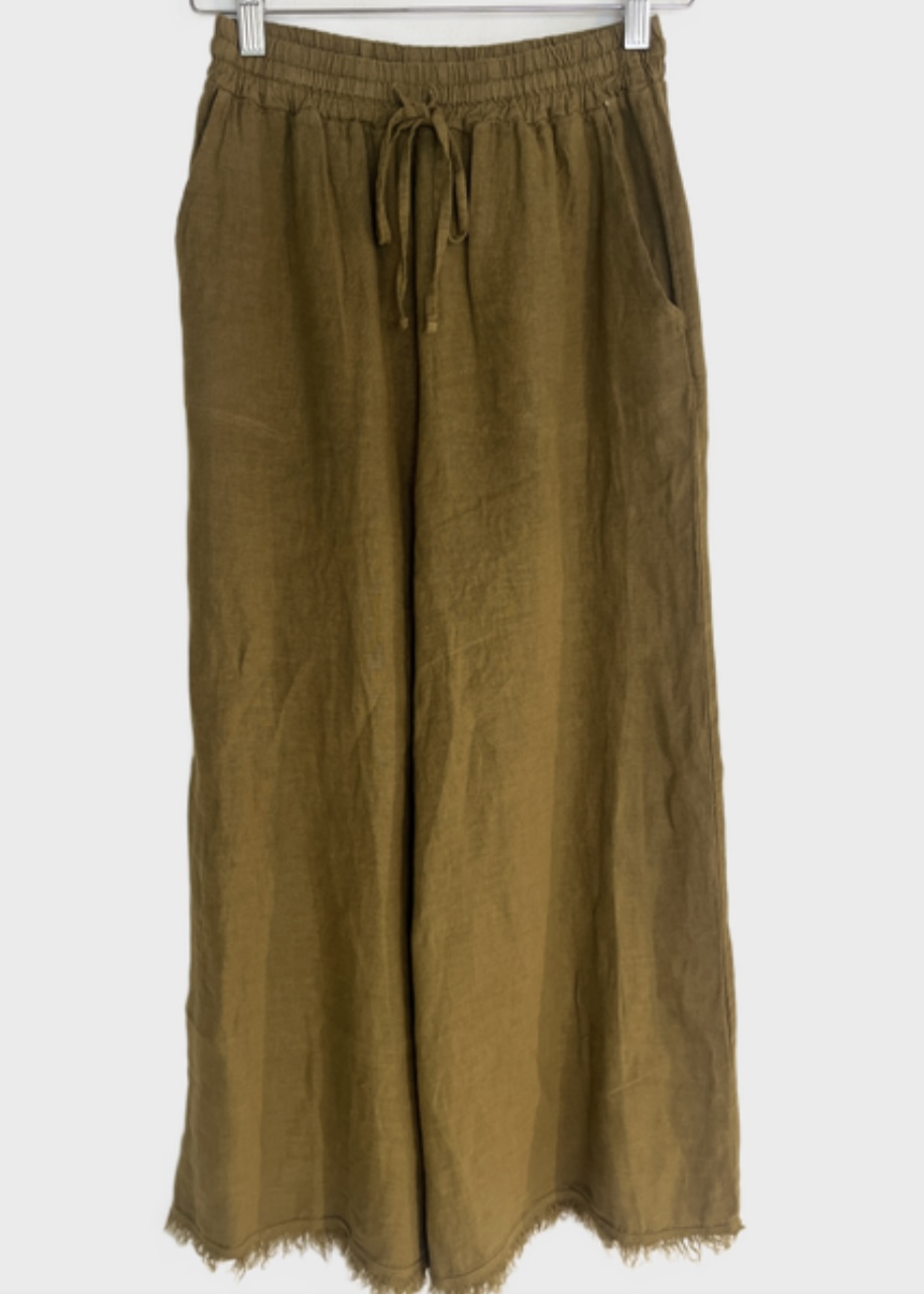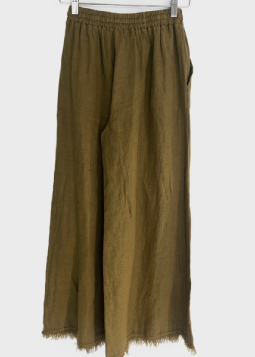 Flowy, chic and effortlessy comfortable, these wide-leg trousers in linen are perfect both for casual and elevated looks. Features an elasticated waistband, side slip pockets and fringes on the hem. The wide-leg silhouette drapes gracefully, giving movement and elegance with every step. Made in Italy.