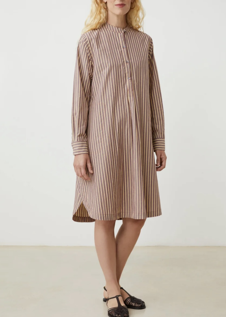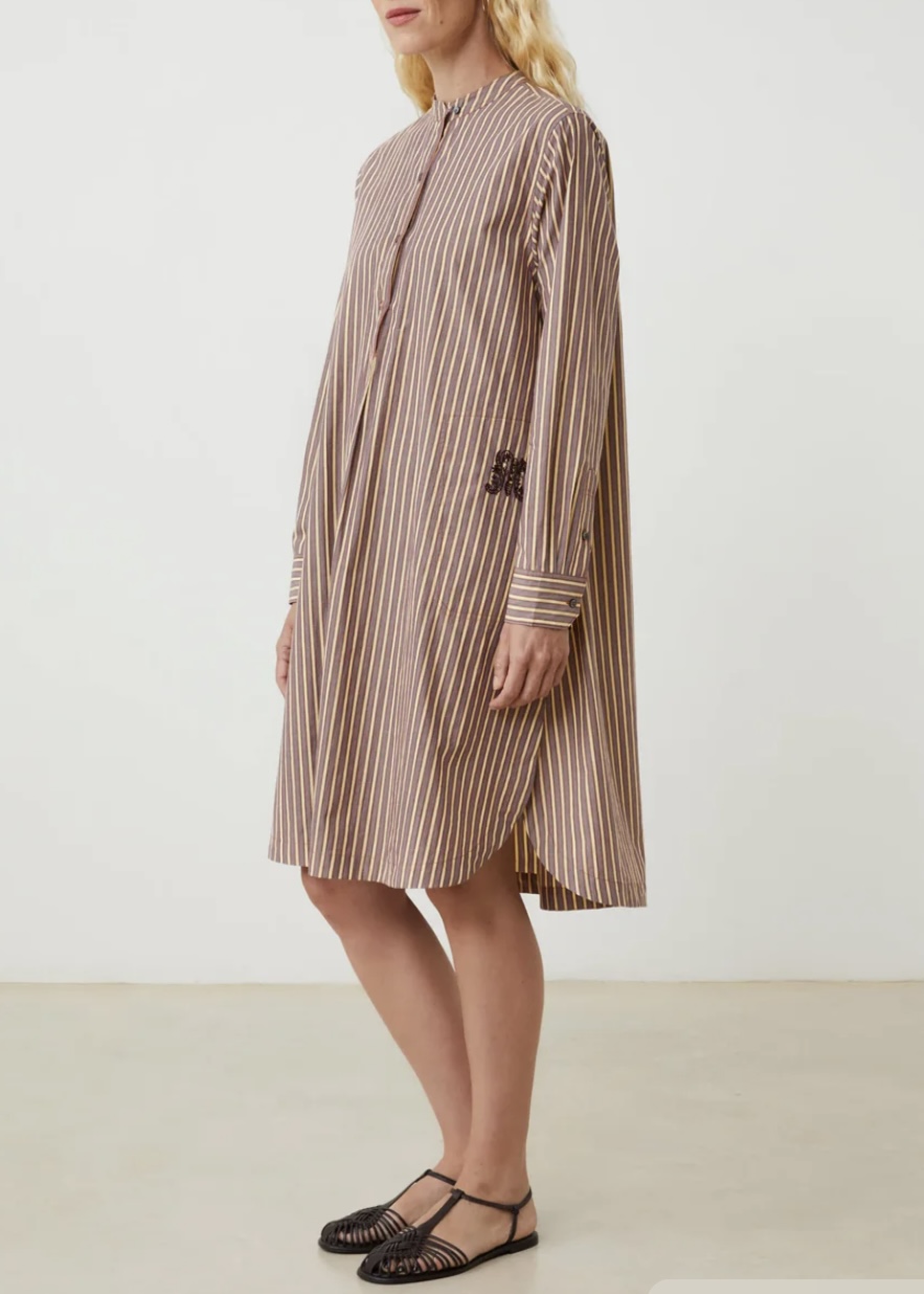 Cotton striped dress, Picardy style. This elegant cotton striped dress is carefully crafted in India, combing refined European inspiration with traditional Indian craftmanship. The dress features a distinctive stand collar and beautifully tailored cuffs adding a touch of classic sophistication. A graceful piece that brings together tradition, comfort and understated elegance. 100% cotton.