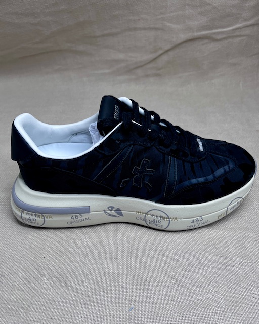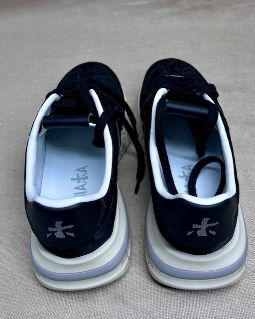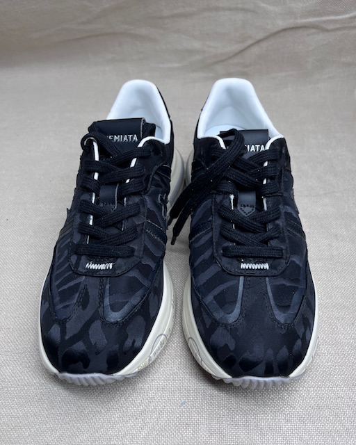 These sneakers crafted from breathable black print pattern fabric. The design is elevated with leather accents on the sides adding a touch of texture.  A slighter higher sole for extra comfort.  Made in Italy.