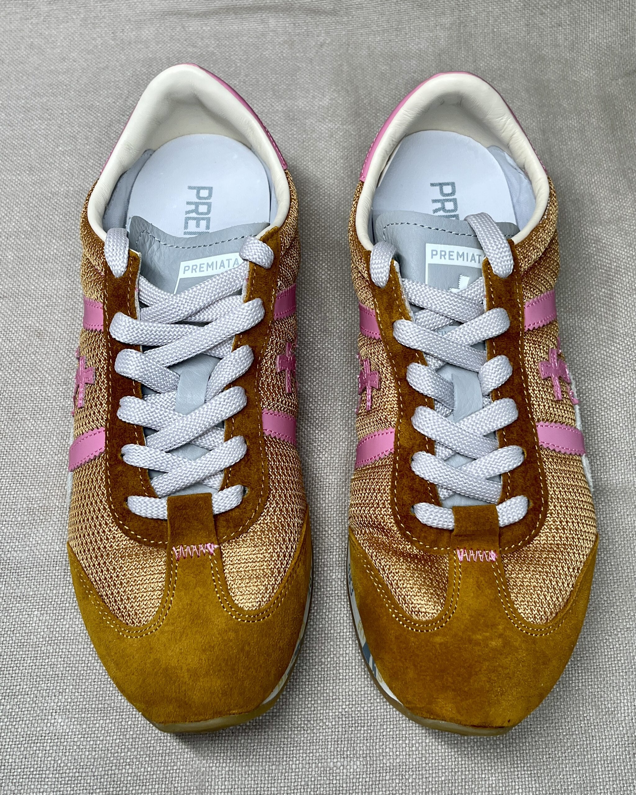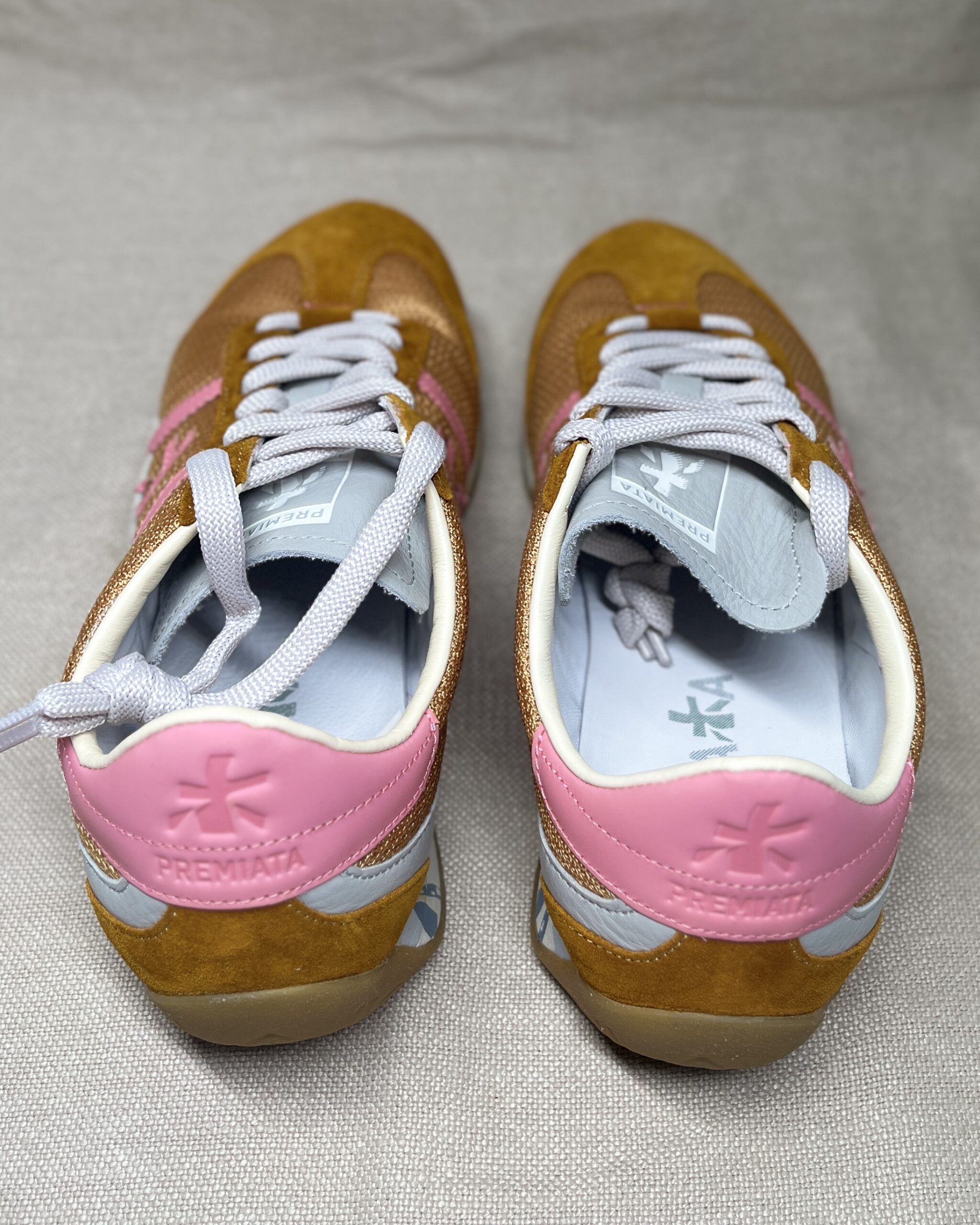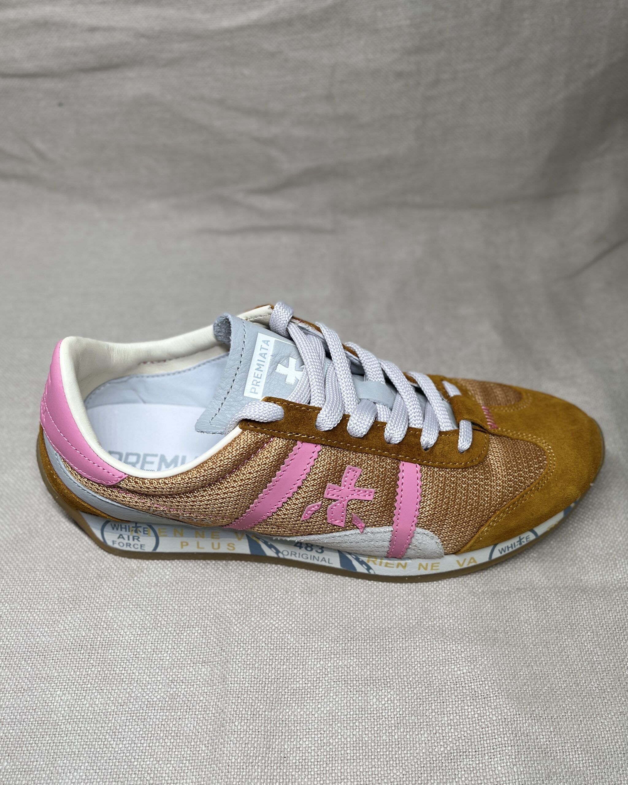 These sneakers made of suede and nylon fabric with pink leather details on the sides and heel tab. Has a great eye for detail. Premiata sneakers are known for their comfortable fit. Comes with an extra pair of laces in pink. Made in Italy.