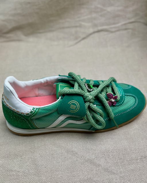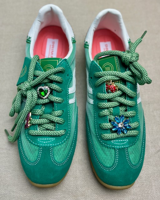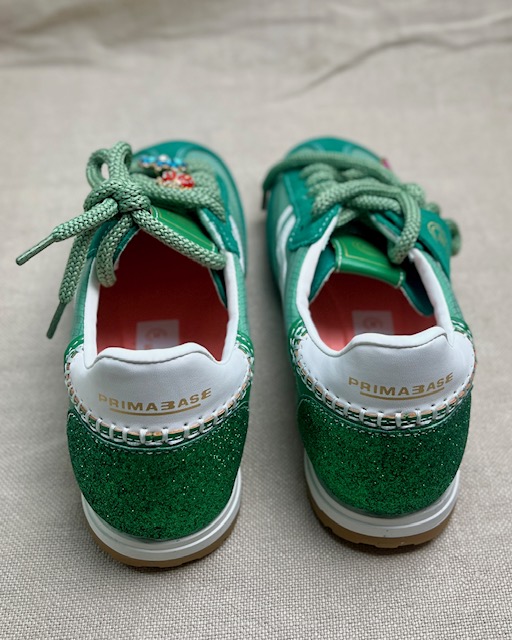 The iconic running sneaker with a vintage and dynamic design, perfect for those looking for grit and style in a single shoe. This sneaker stands out for its upper in mesh and green suede, combined with light-coloured side inserts that give it a sporty yet refined look. The green cotton laces are embellished with multicoloured jewelled charms, a unique detail for a glamorous style. The rubber sole, with a natural finish, reinforces the 1970s running vibe but ensures comfort and versatility for everyday use. Made in Italy.