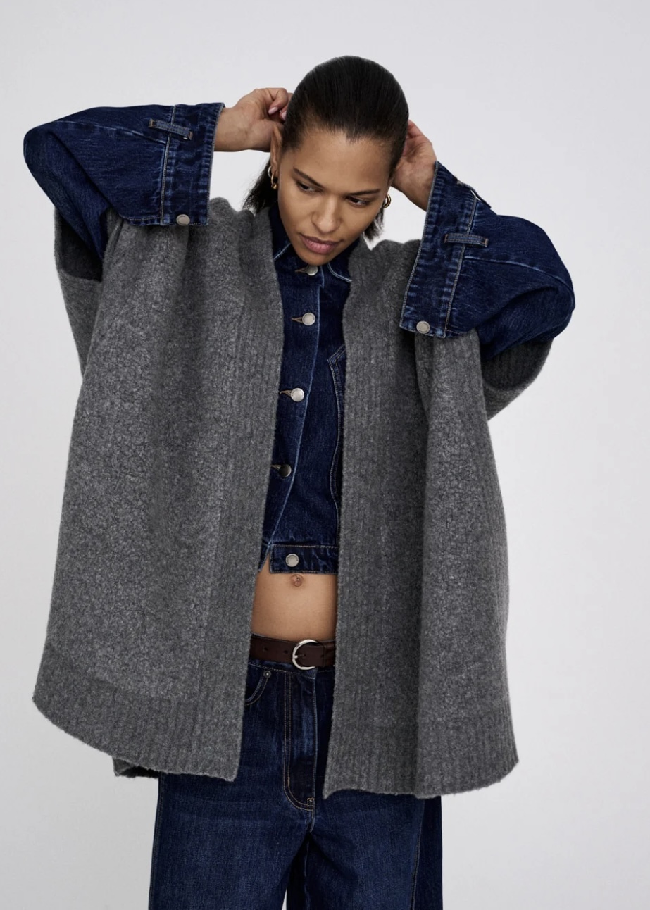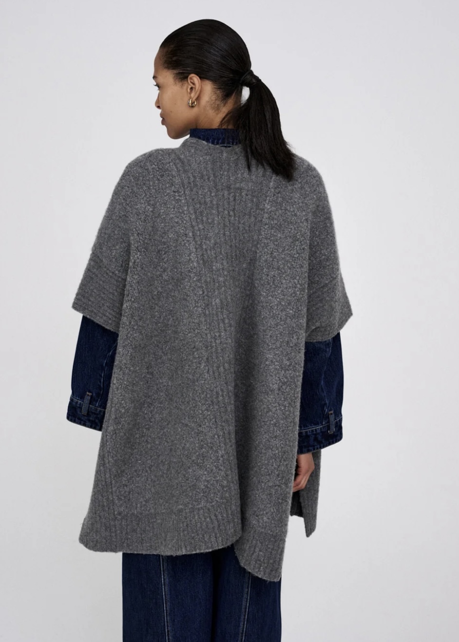 Add sophisticated elegance to your knitwear ensemble with the sheep knit cape. Crafted from a soft, woollen fabric, the stylish knit cape is defined by an oversized, boxy silhouette with ribbed details and a split in the back. Truly a stand-out knit elevating the wardrobe. One size fits all.