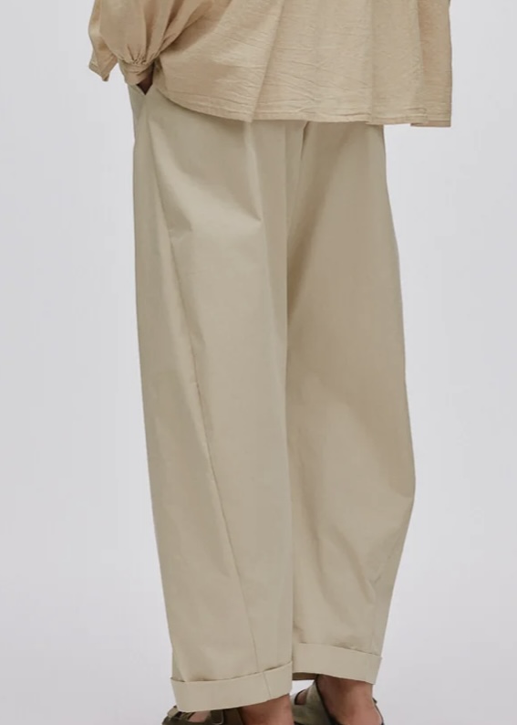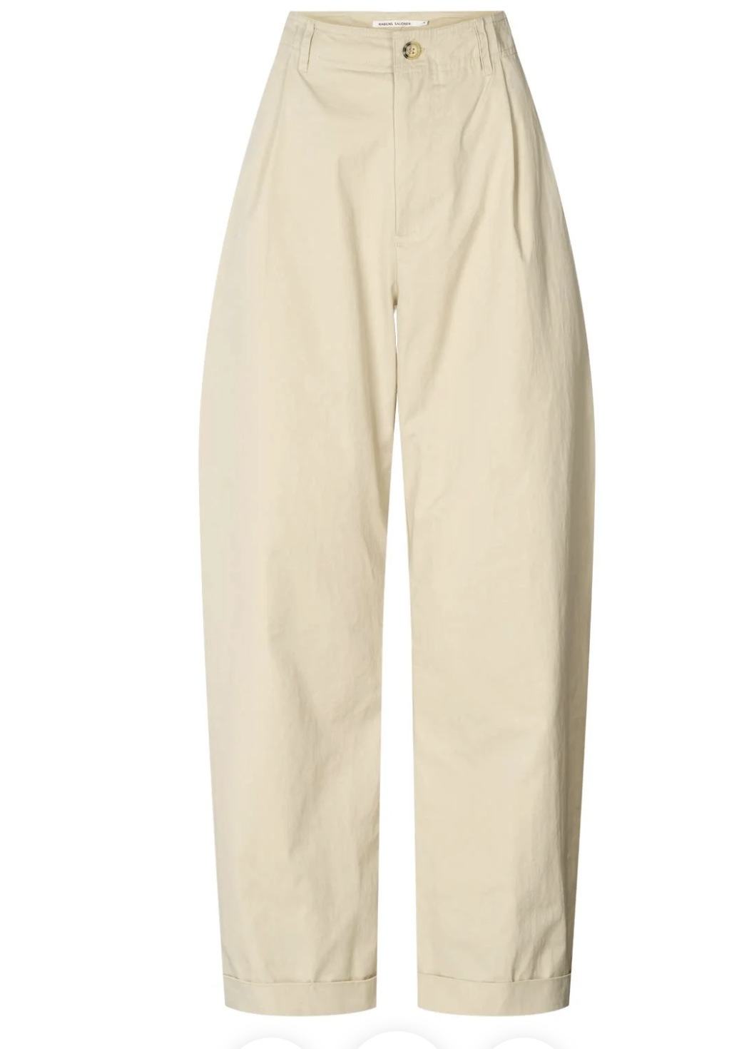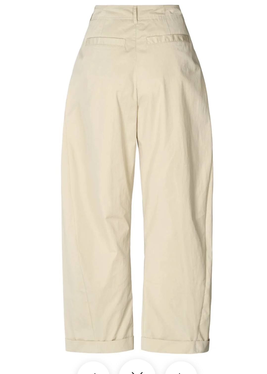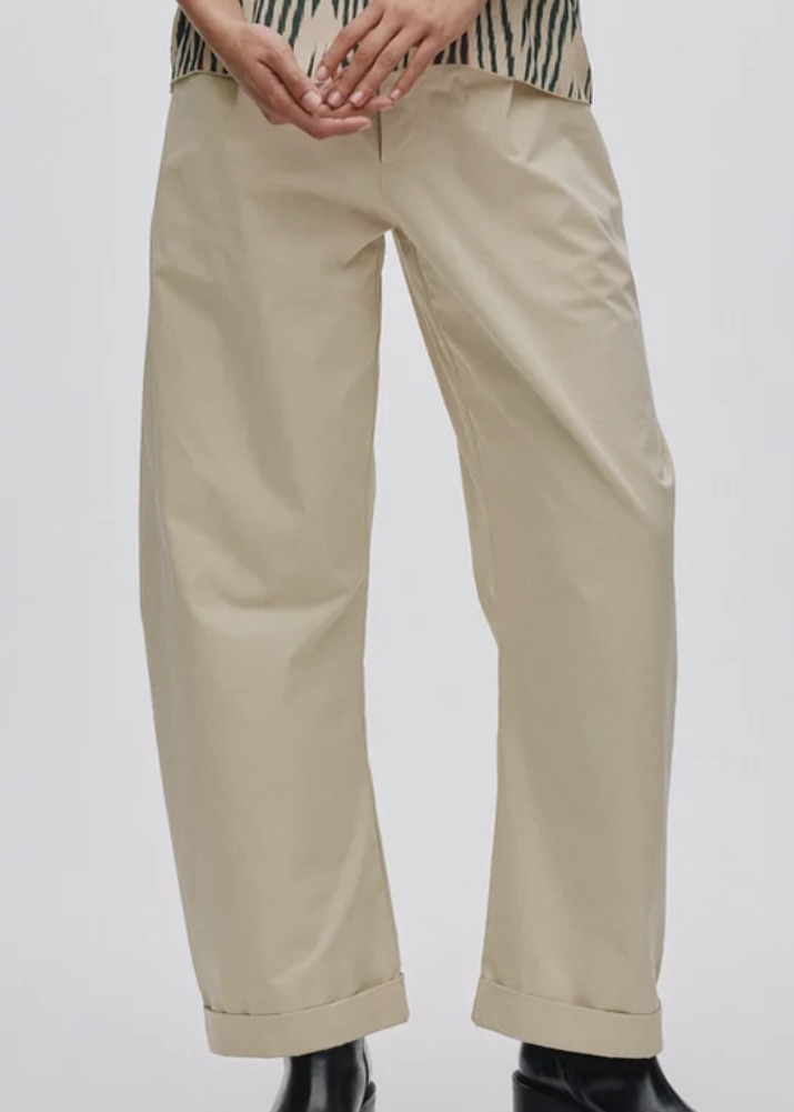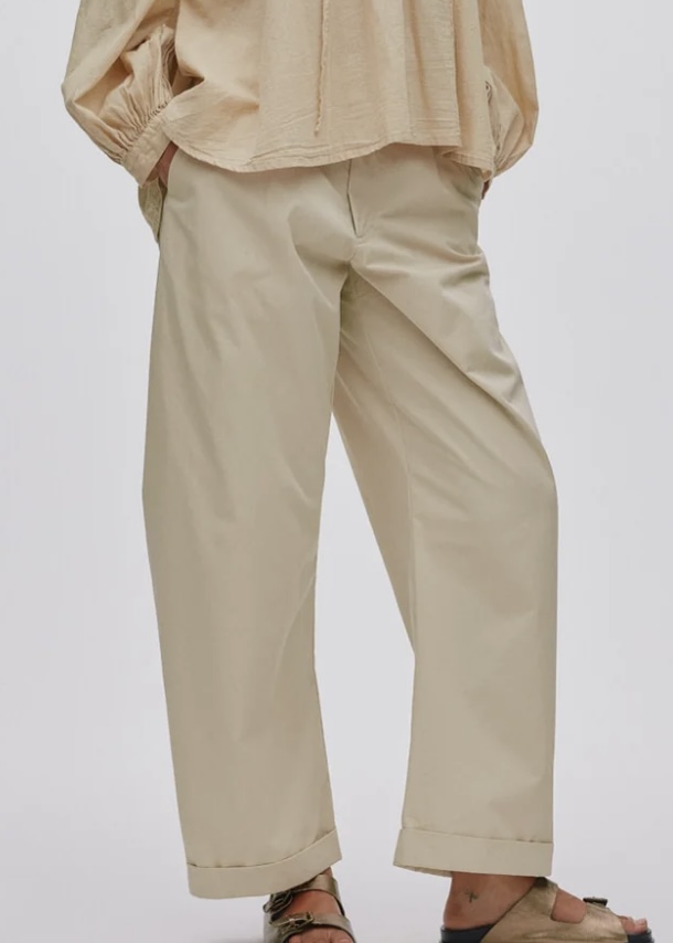 These trousers are characterised by a simple and clean design, offering versatile styling options. Craftede from cotton-blend material. The design is relaxed, featuring a regular waist and loose, straight legs with a cuffed hem. They are detailed with a zip and button closure, side and back pockets, and belt loops. Perfect for both everyday wear and special occasions.