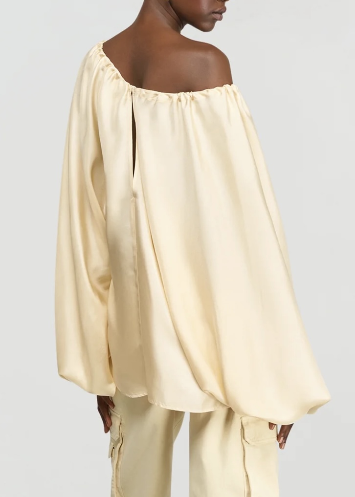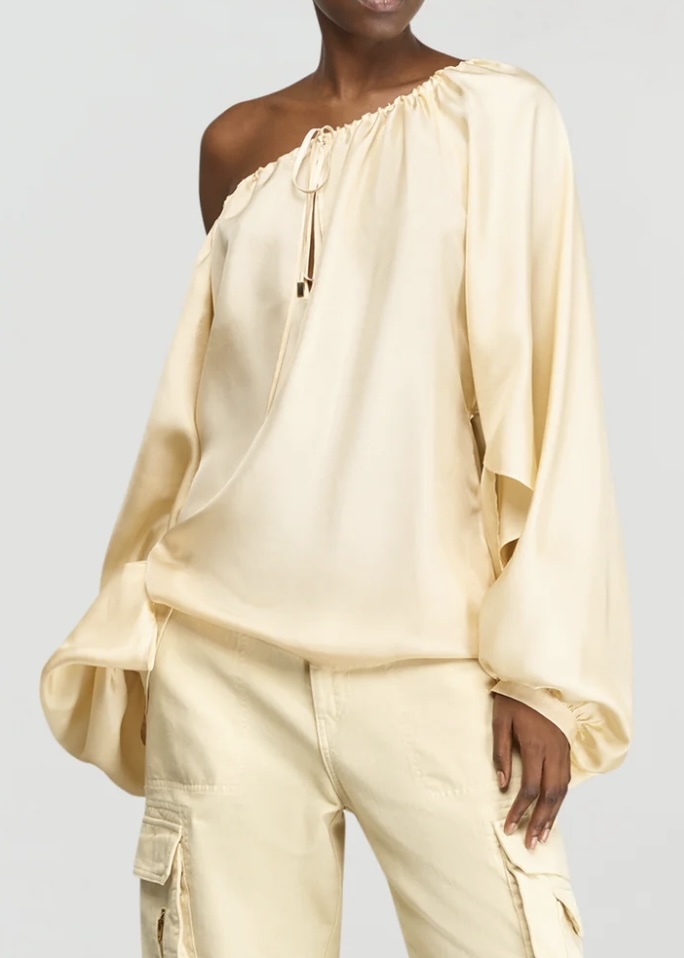 Seimicouture channels an ethereal mood by crafting this  beige blouse from fluid silk, features a  gathered neckline , gold tone neck-tie and floaty drapped sleeves with open slits.  Made in Italy.