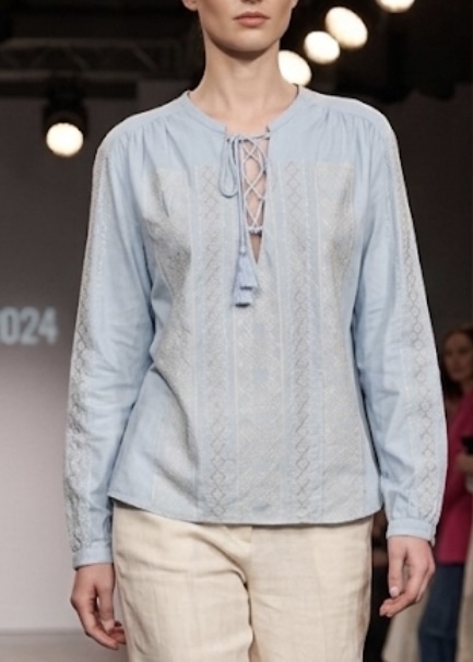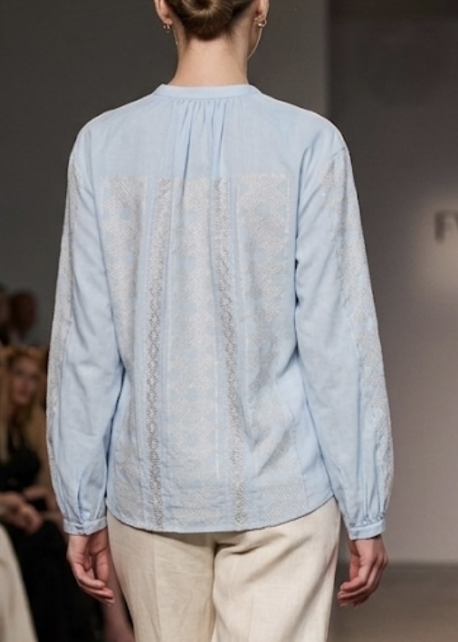 Semicouture woven cotton blouse. Featuring fine embroidery, tie-fastening stand collar, raglan sleeves, keyhole at bust. Curved hem and slips on. 100% cotton.
