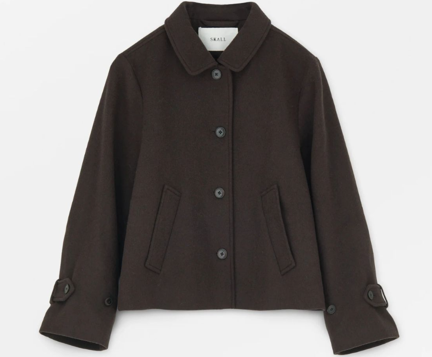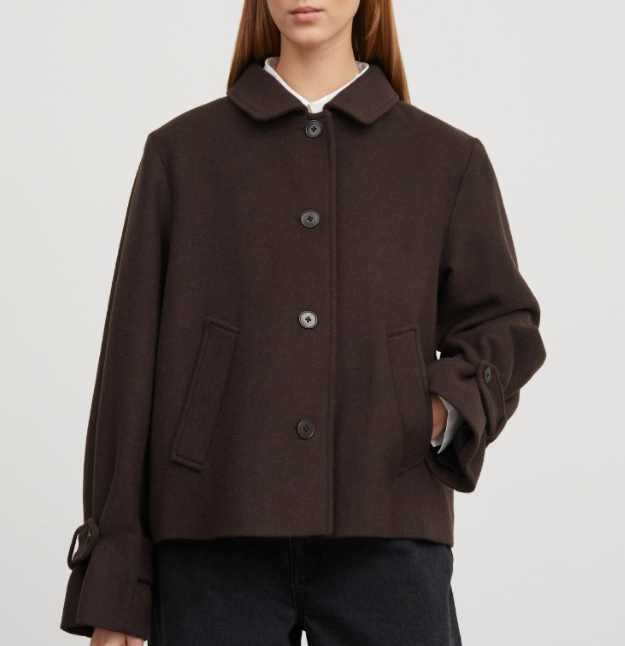 Ally jacket is a short A-shaped jacket crafted from Italian fabric of 100% wool. Features a round neck with a collar and clean lines. It has two front pockets and a front closure. The raglan sleeves have adjustable straps. Lining 100% organic cotton, Corozo buttons made of nut shells. A stylish tailored piece designed for a flattering fit, making it perfect for both formal and casual wear.